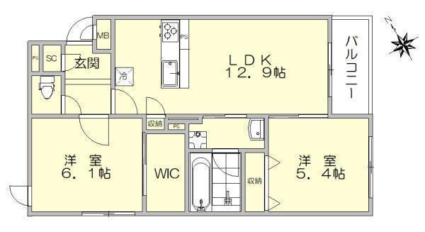 LDK 12.9帖 、洋 6.1帖 、洋 5.4帖